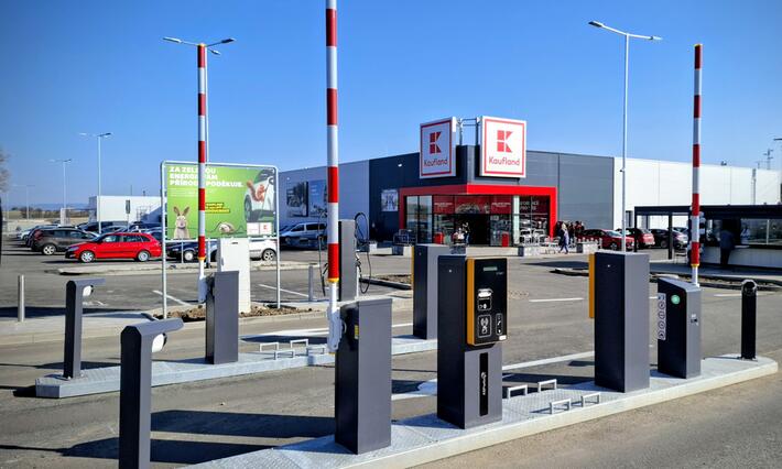 Kombinovaný parkovací systém s lístky i kamerami před prodejnou Kaufland Hořovice