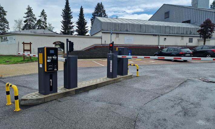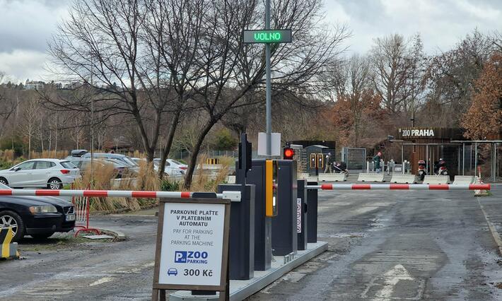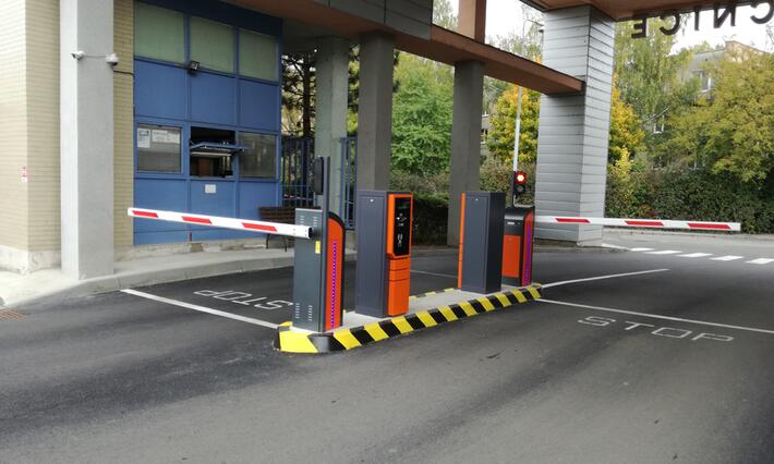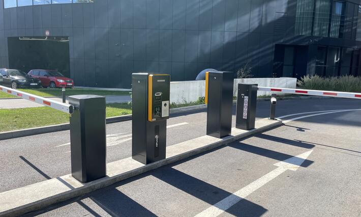 Chytrý systém s parkovacími automaty a závorou pro venkovní parkoviště