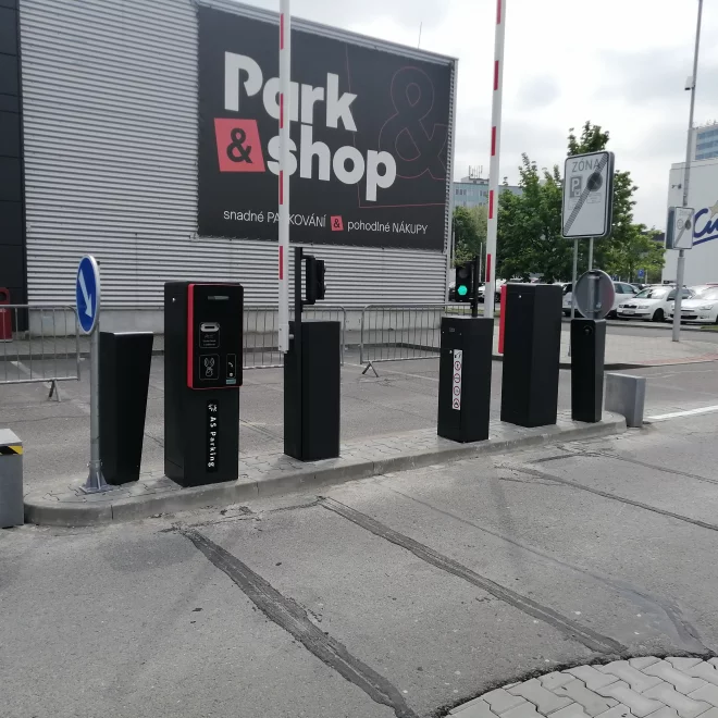 Rozsáhlá instalace samoobslužného parkovacího systému pro ostravské nákupní centrum, která zahrnovala vjezdové závory a terminály pro vícero vjezdů
