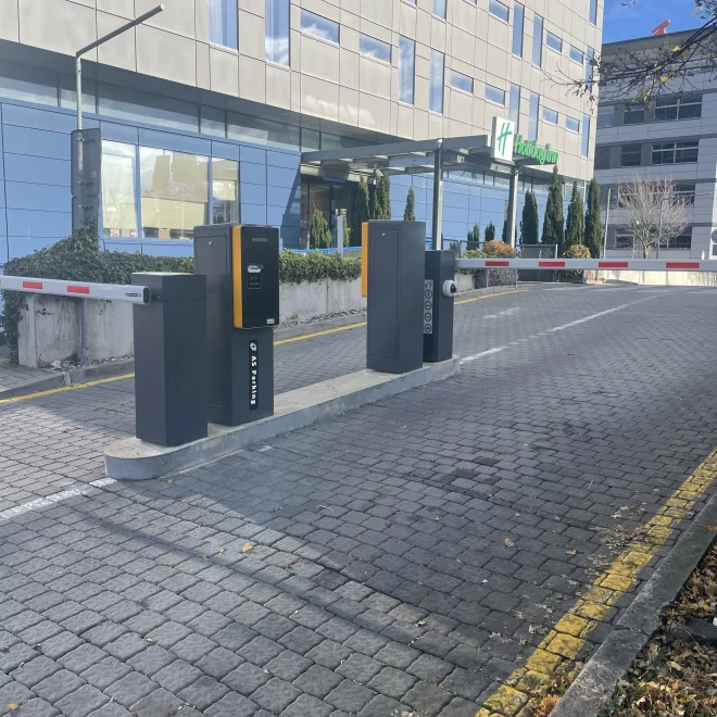Základní automatický parkovací systém AS Parking se dvěma standardními závorami, vjezdovým a výjezdovým terminálem a vzdálenou recepcí hotelu Holiday Inn.