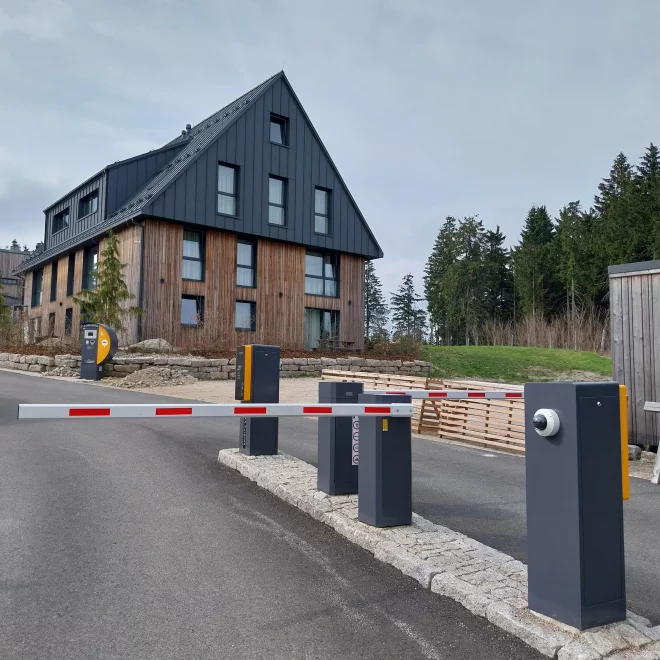 Na parkoviště Hotelu Královka jsme nainstalovali dvě parkovací závory PARK – jednu na vjezd a druhou na výjezd. Takovéto rozmístění je výhodné a efektivní, protože umožňuje současně příjezd i odjezd nezávisle na sobě, díky čemuž se mimo jiné také snižuje riziko kolize. K závoram jsme nainstalovali terminály na výdej a skenování parkovacích lístků.