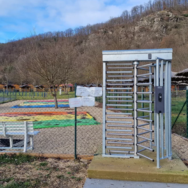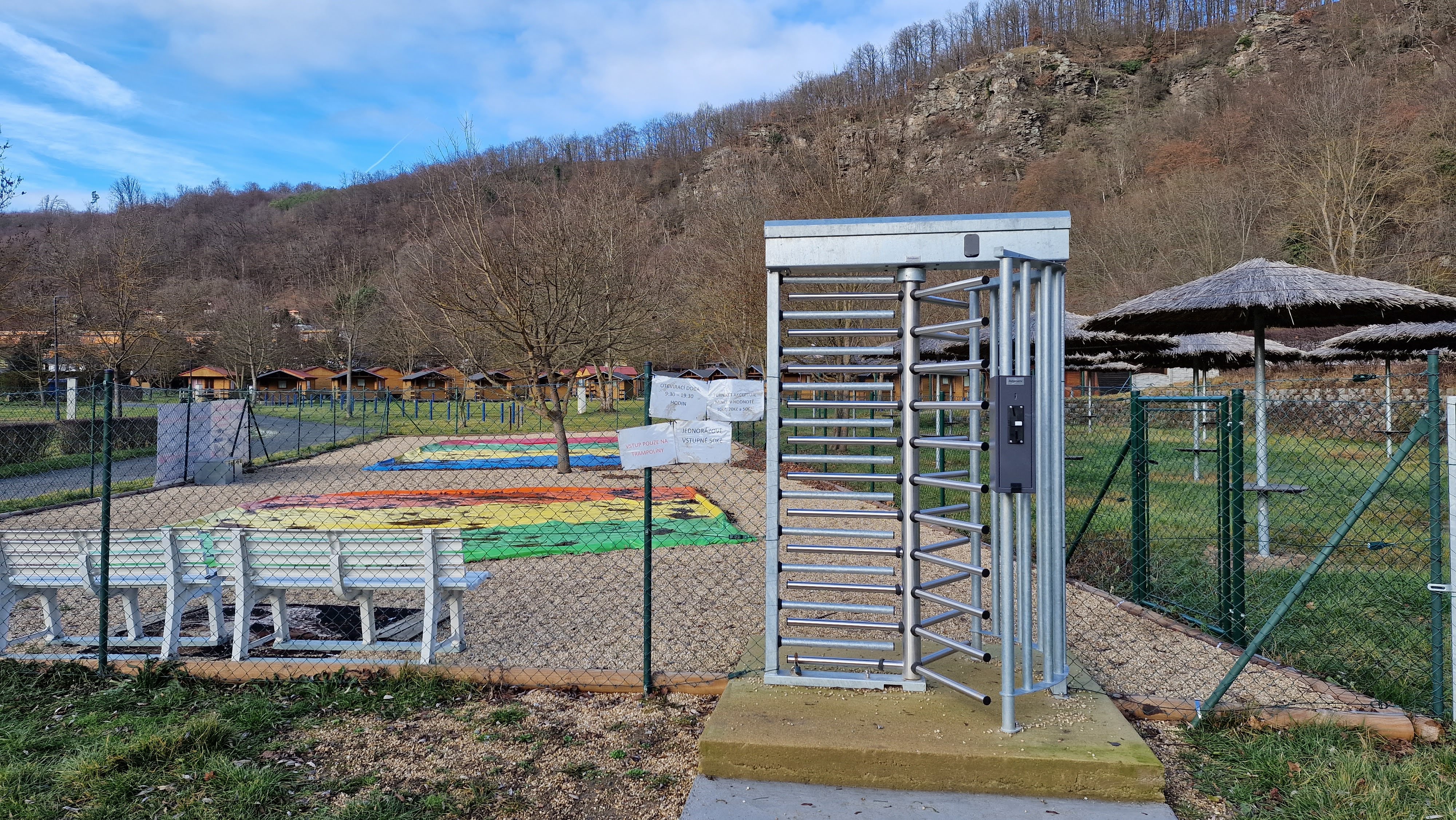 Plnorozměrný turniket zpoplatňující vstup na hřiště v kempu