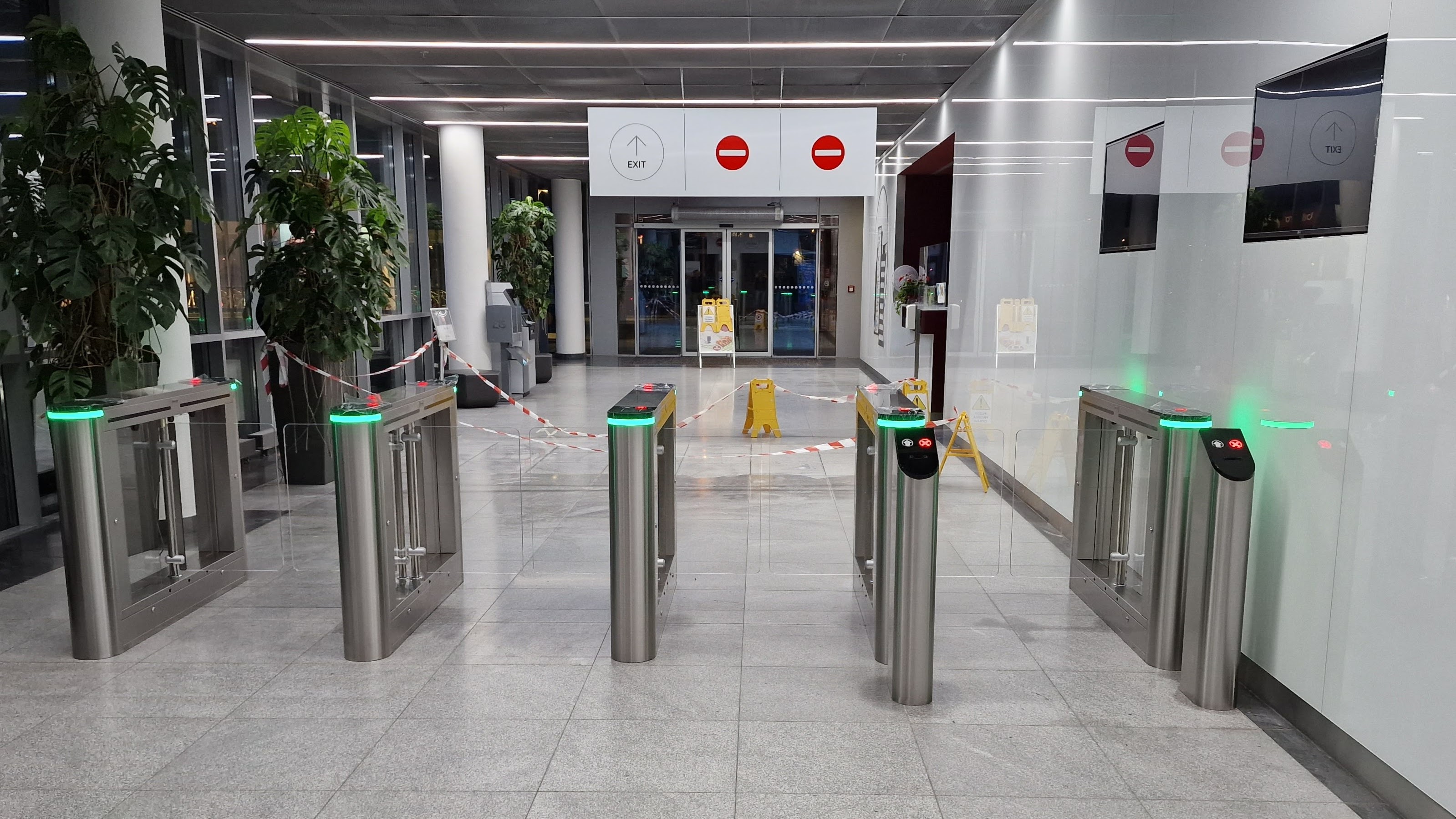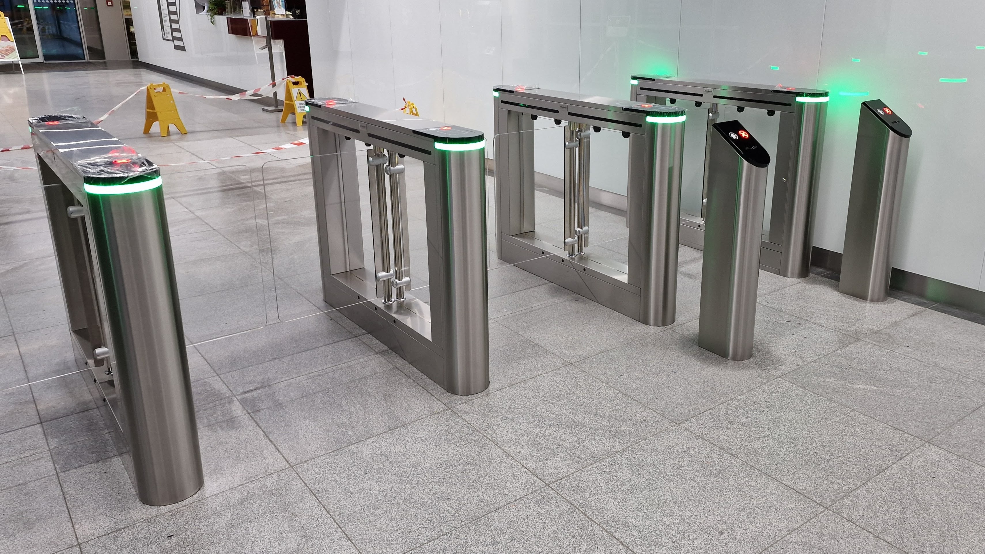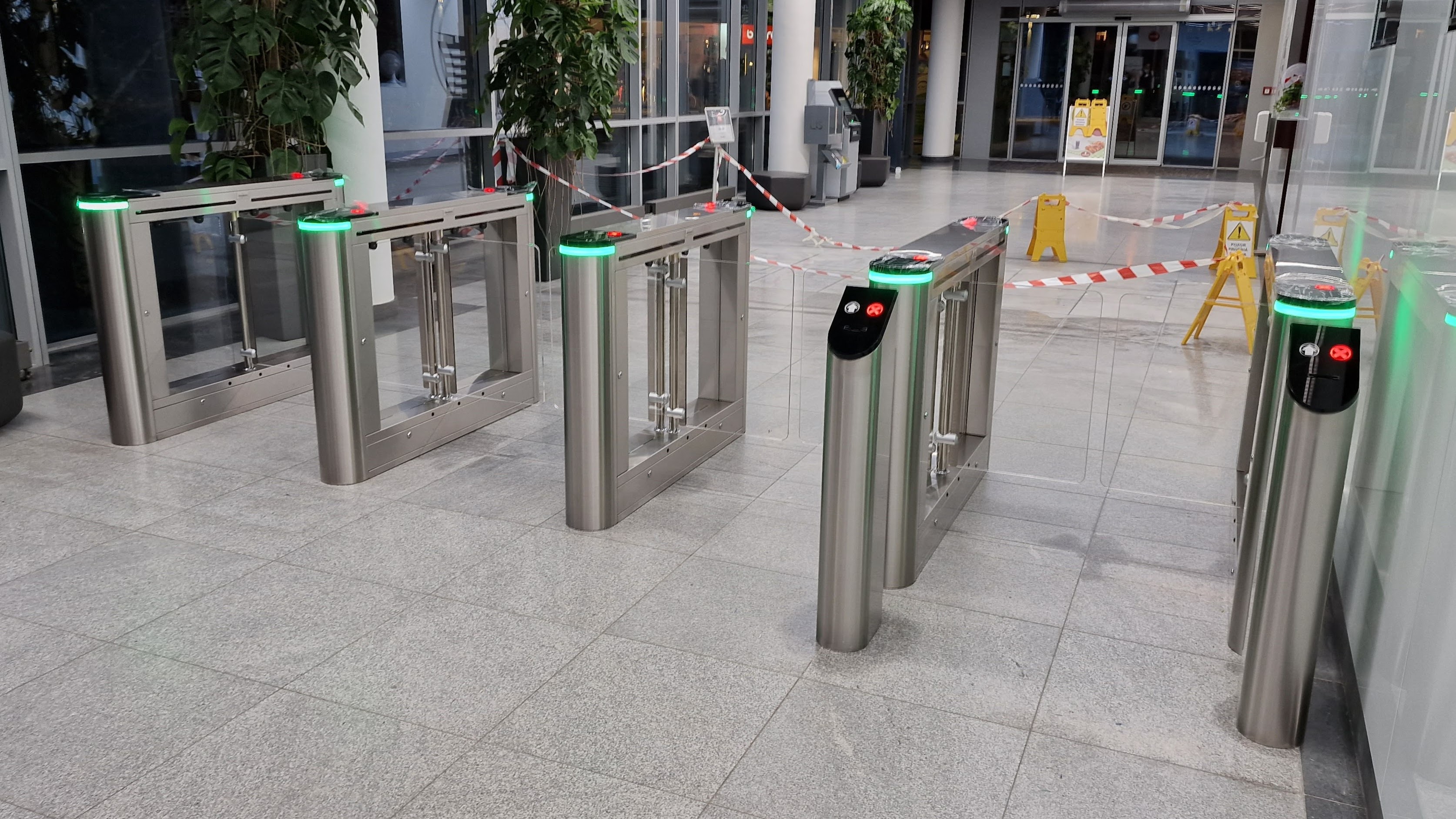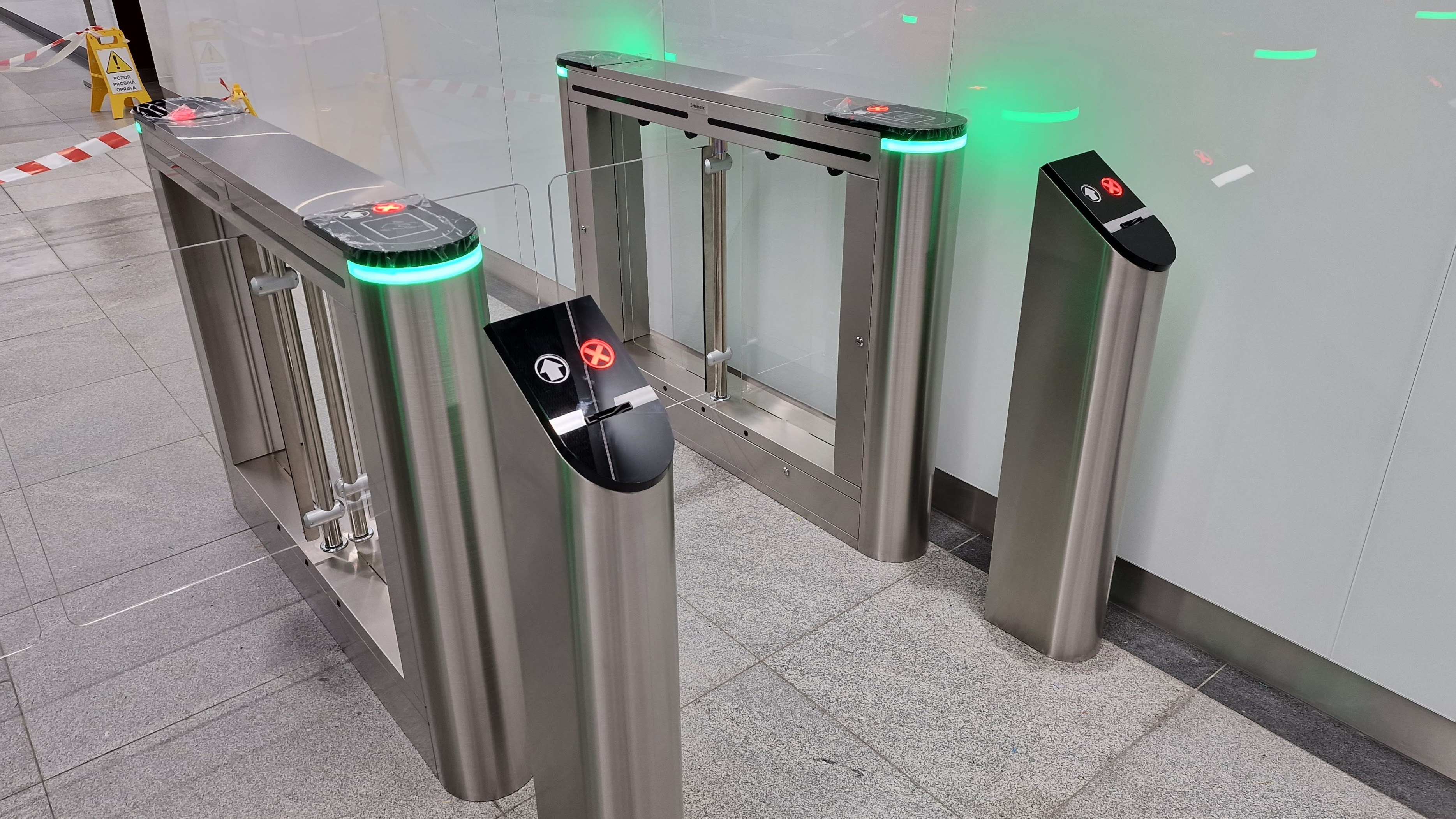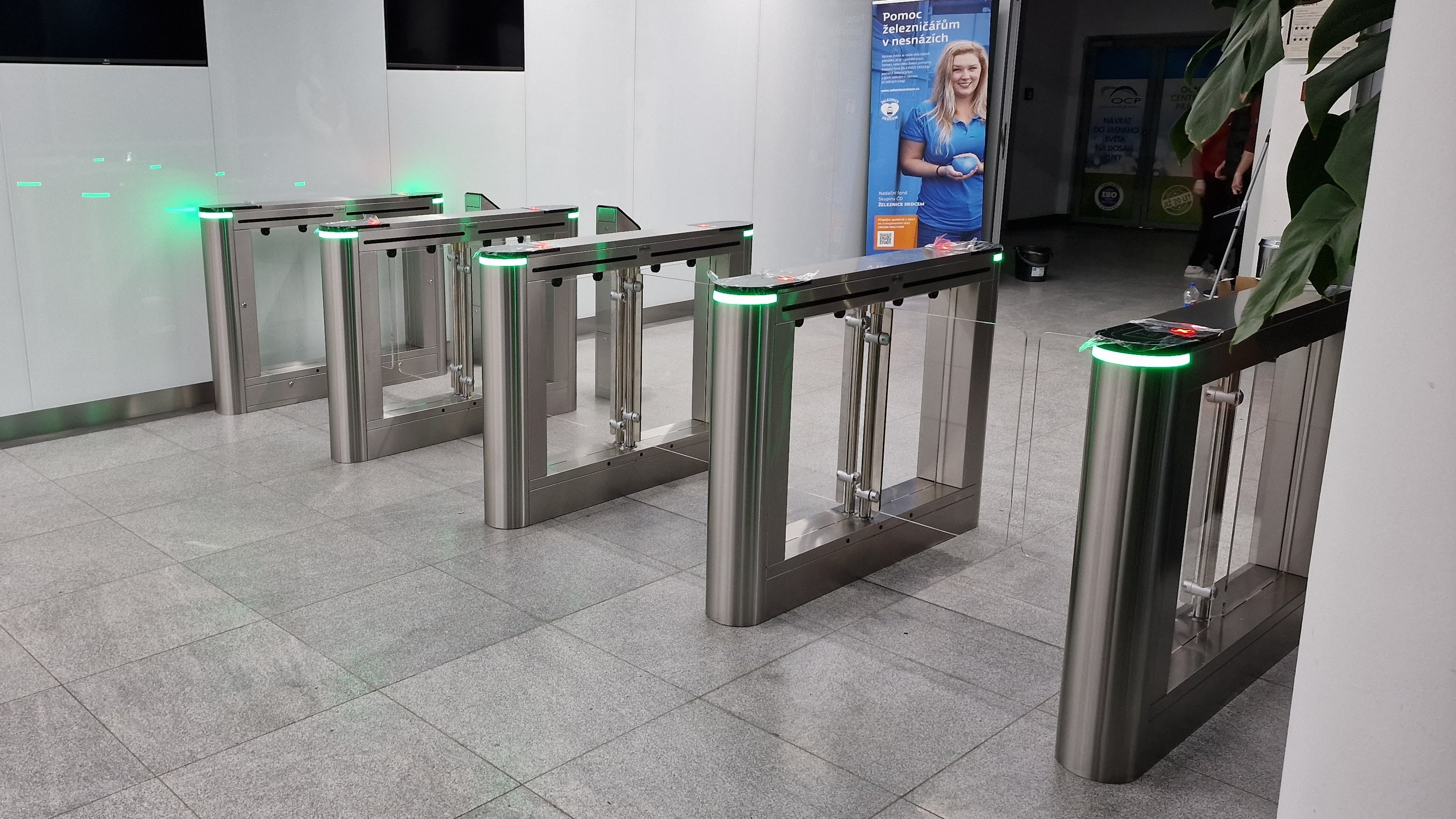 Křídla z průhledného skla zajišťují, že nejsou skoro vidět, čímž nabízejí téměř nerušený průchod zaměstnanců a lidí v budově. V prostoru tak maximálně vyčnívají stříbrné turnikety a světelná znamení.