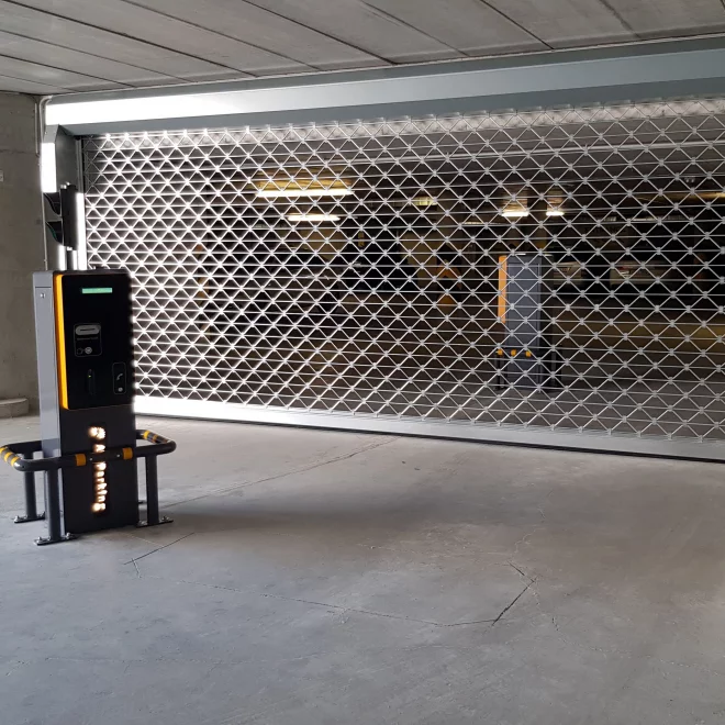 Atypický parkovací systém, který je spravovaný vjezdovými terminály a k nimž jsme neinstalovali automatické závory, ale pouze je napojovali na rolovací mříž.