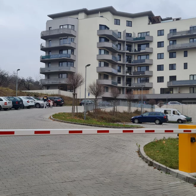 Vjezdová závora na parkoviště u bytového domu v Brně