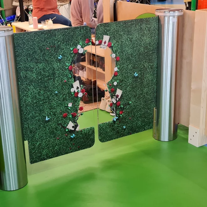 Malé děti potěší tmavě zelený potisk s hravými obrázky a jakoby klíčovou dírkou na rozhrání skleněných dvířek vstupní branky, které se při průchodu rozevřou. Jedná se o důmyslné řešení vytvořené přímo na míru. Podobně a jinak lze upravovat jakékoliv vstupní branky, ale také ostatní produkty AS Parking, jako jsou turnikety a speedgate brány nebo parkovací závory.