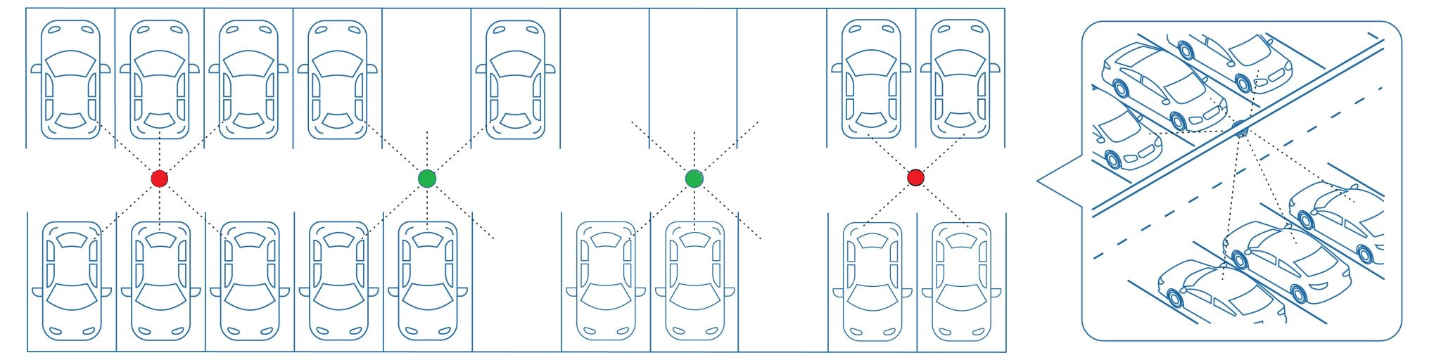 Tyto detektory s kamerami zachycují fotografie parkoviště v reálném čase, a získavají tak stav parkování každého parkovacího místa.