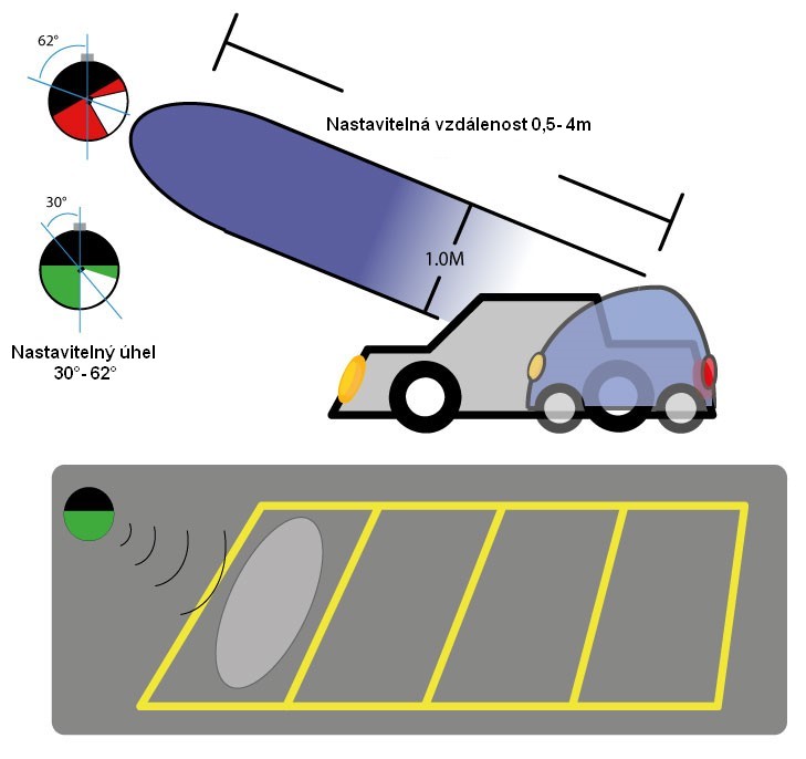 Diagonální ultrazvukový detektor slouží pro detekci obsazenosti parkovacího místa. Instaluje se nad krajem parkovacího místa s přímou viditelností projíždějícími vozidly.