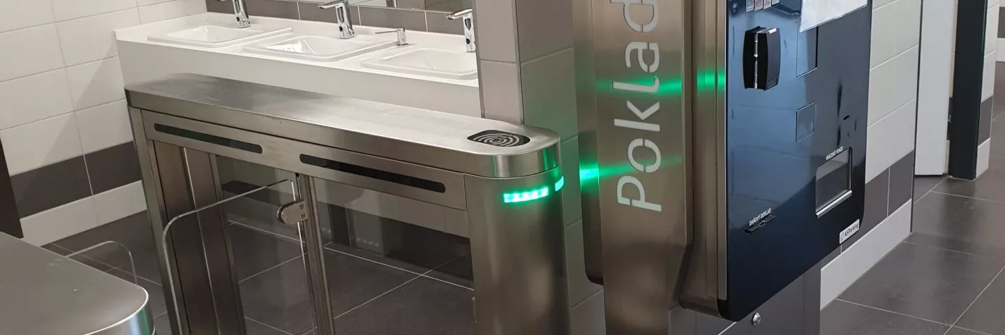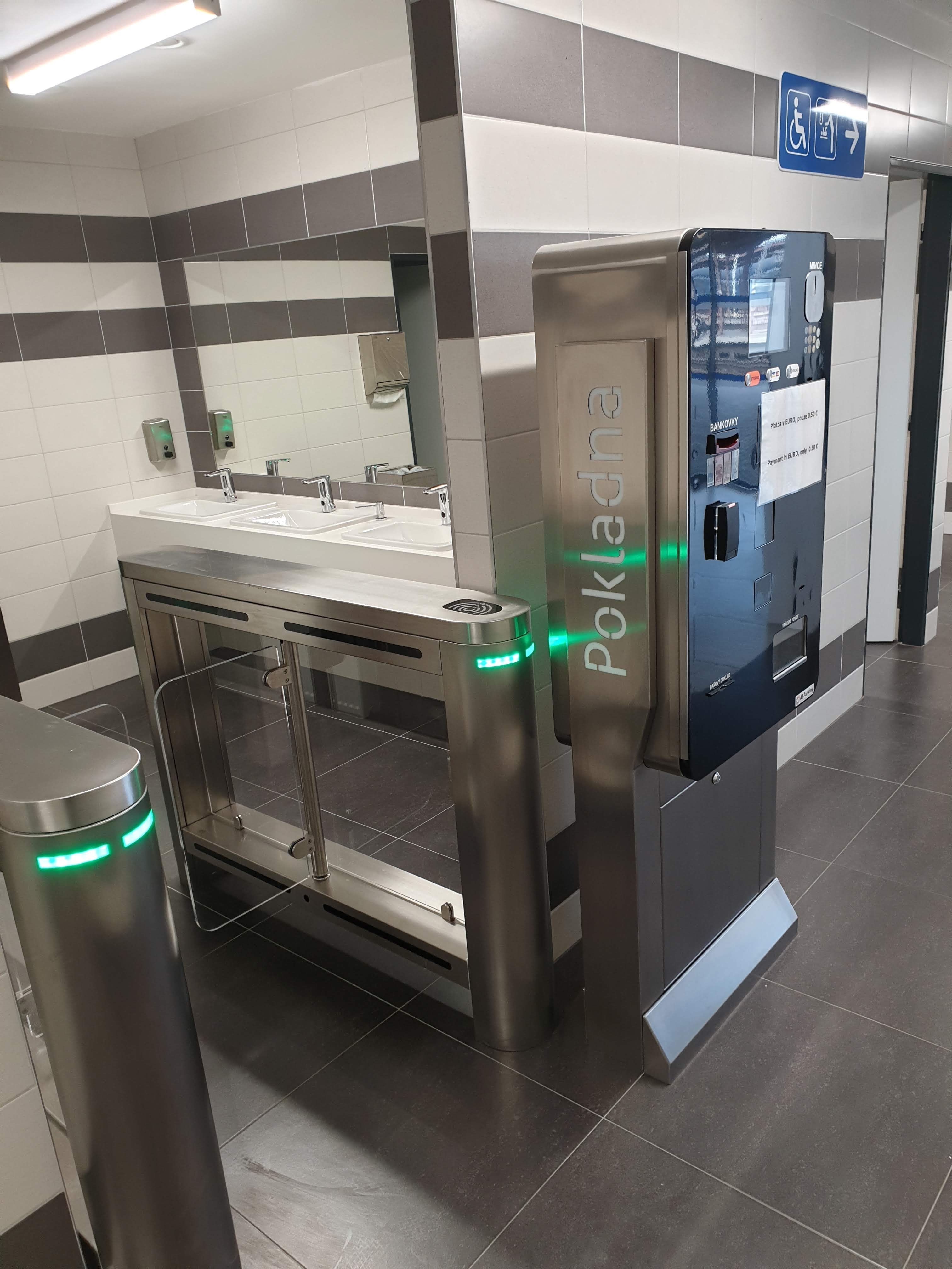 Speedgate turnstiles and automatic cash register in stainless steel design, coins and bills accepted.