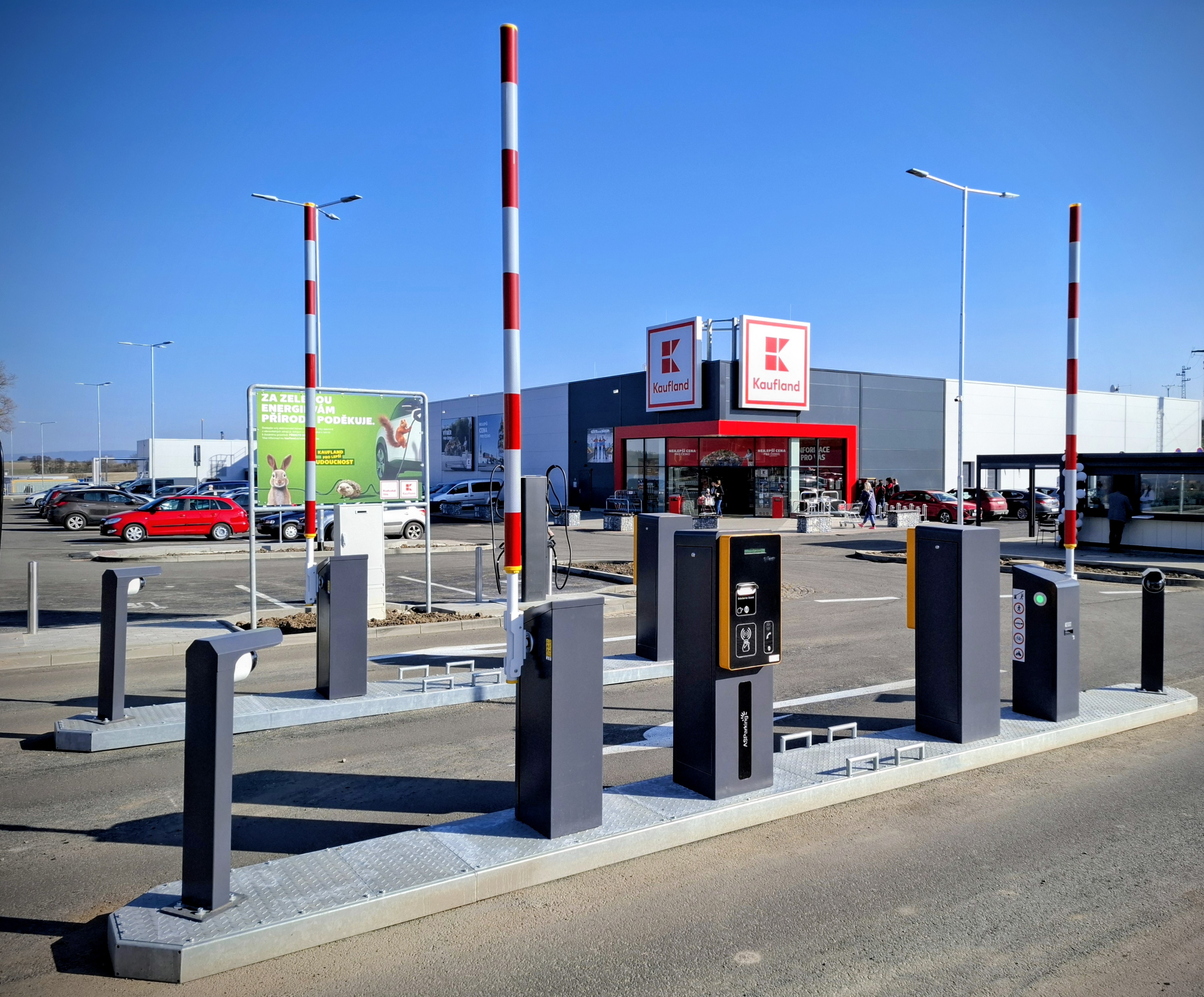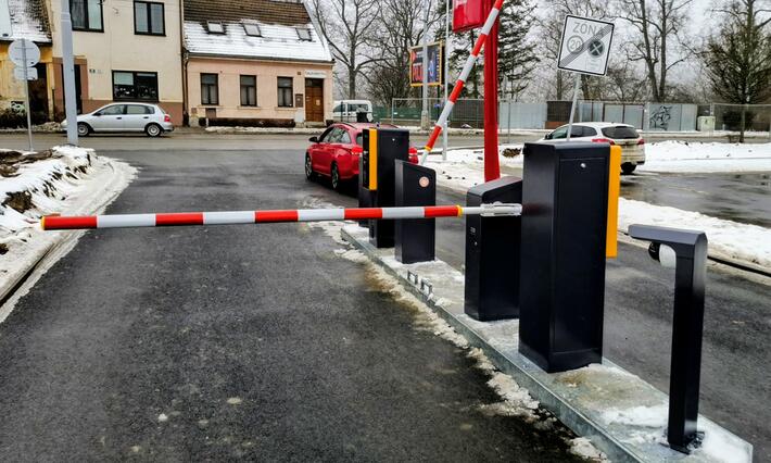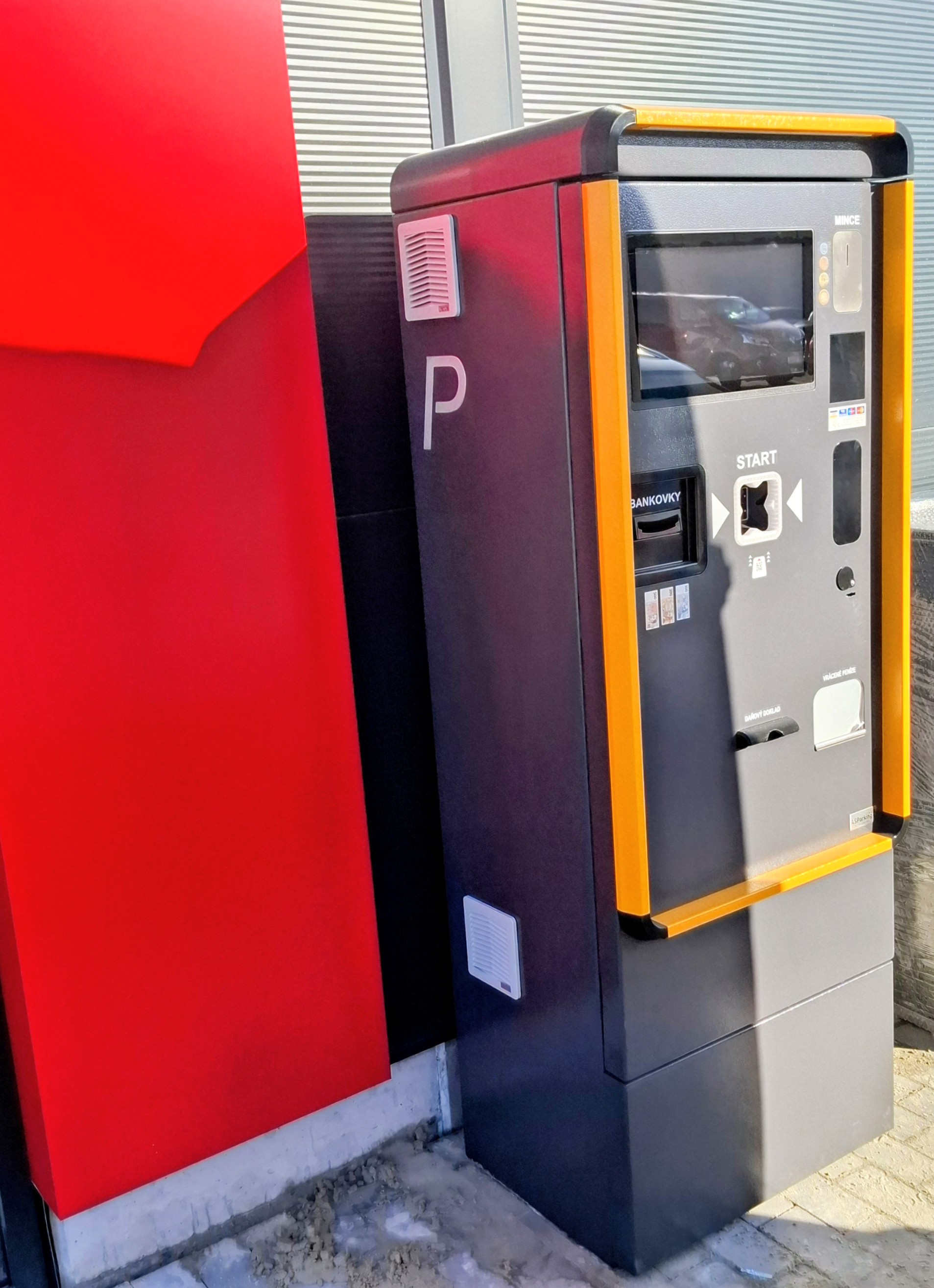 Combined parking system with tickets and cameras in front of the Kaufland Hořovice store