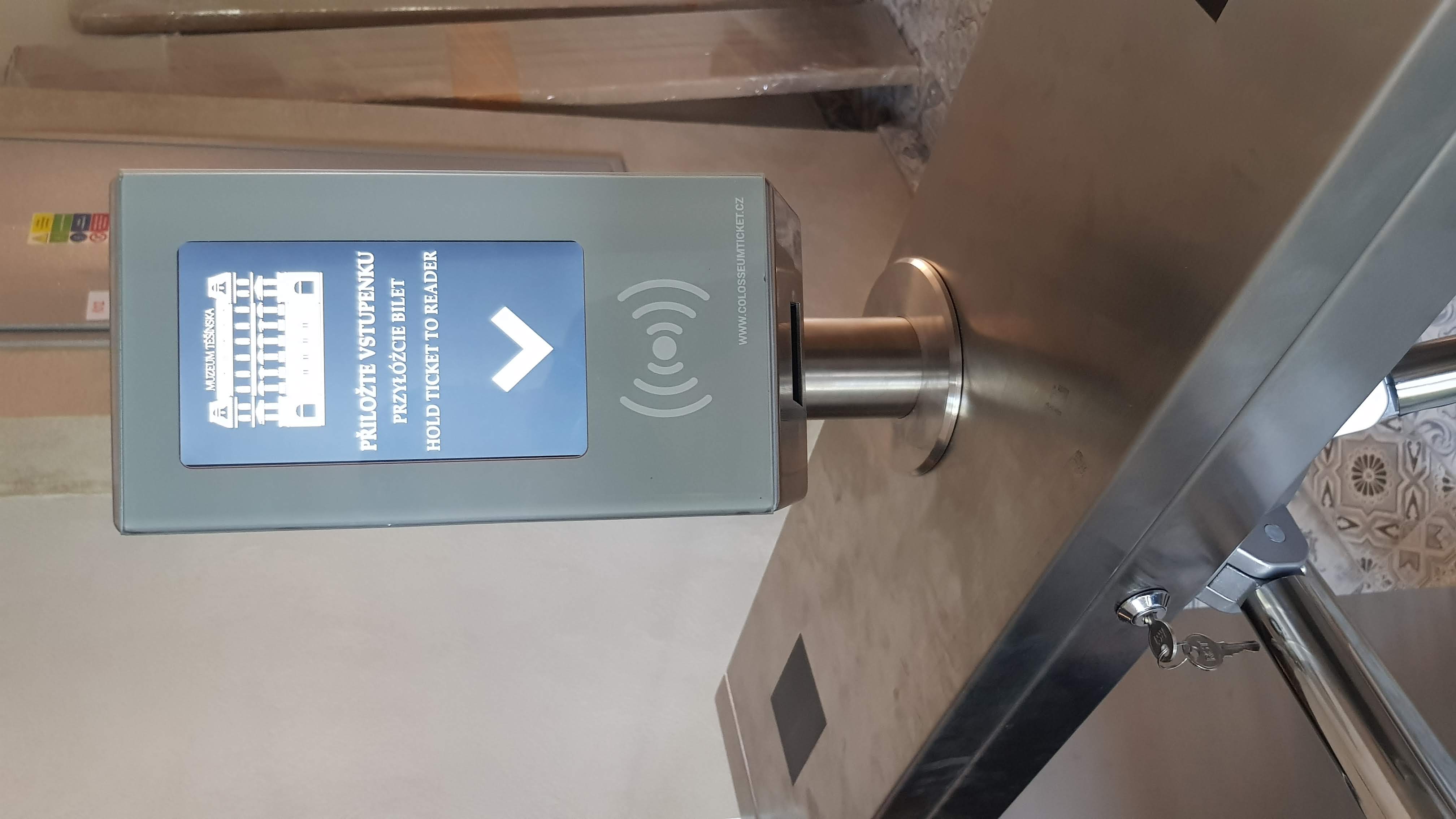 A narrow tripod turnstile at the entrance combined with an entrance gate for barrier-free access to the premises of the Těšín Museum, both supplemented by simple LED panels and tapes.