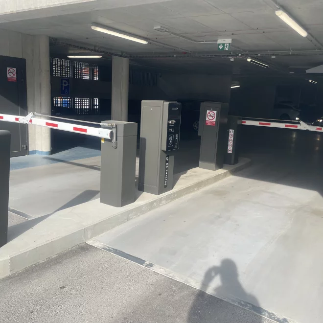 Self-service parking system with two parking barriers, entry and exit terminal, license plate recognition and two automatic cash registers