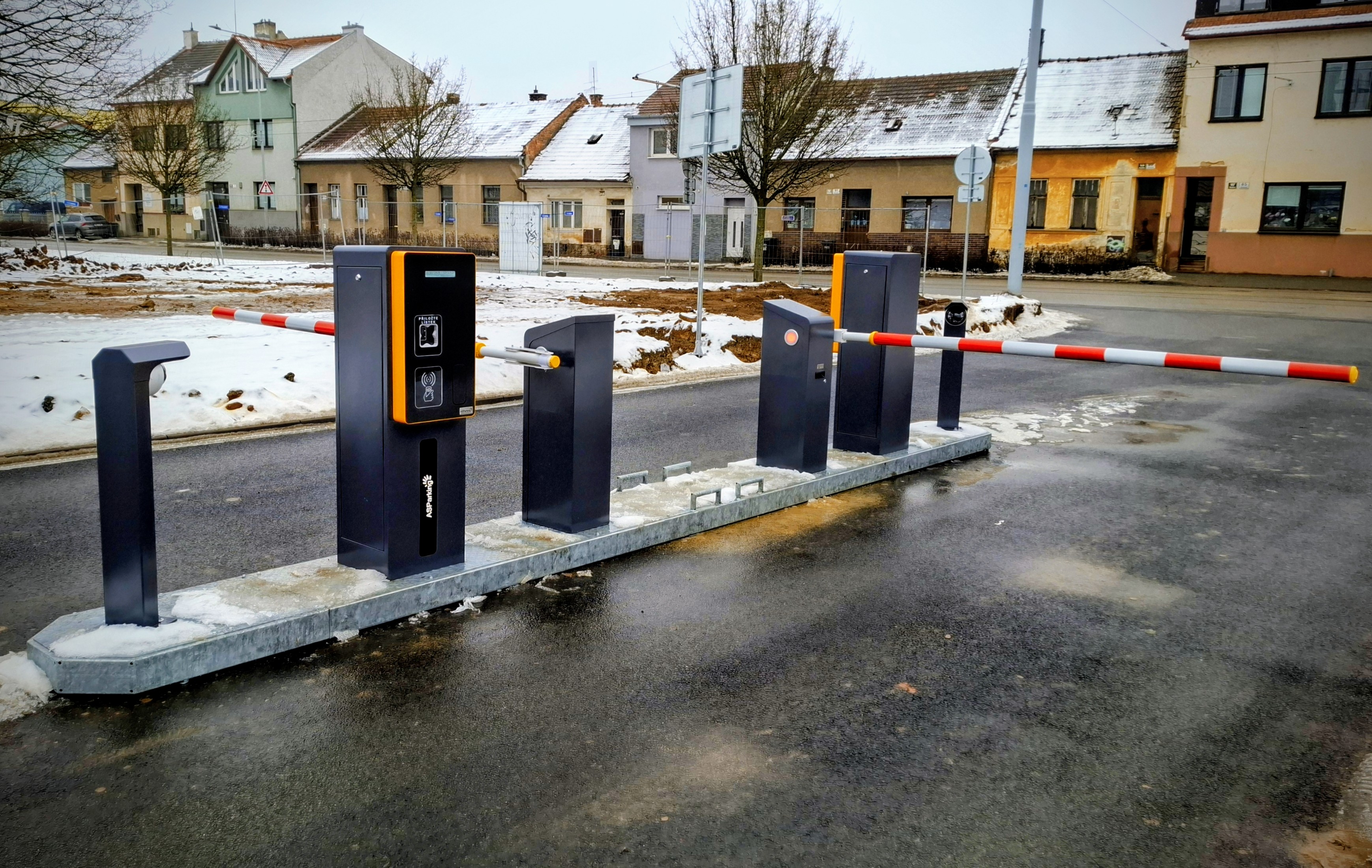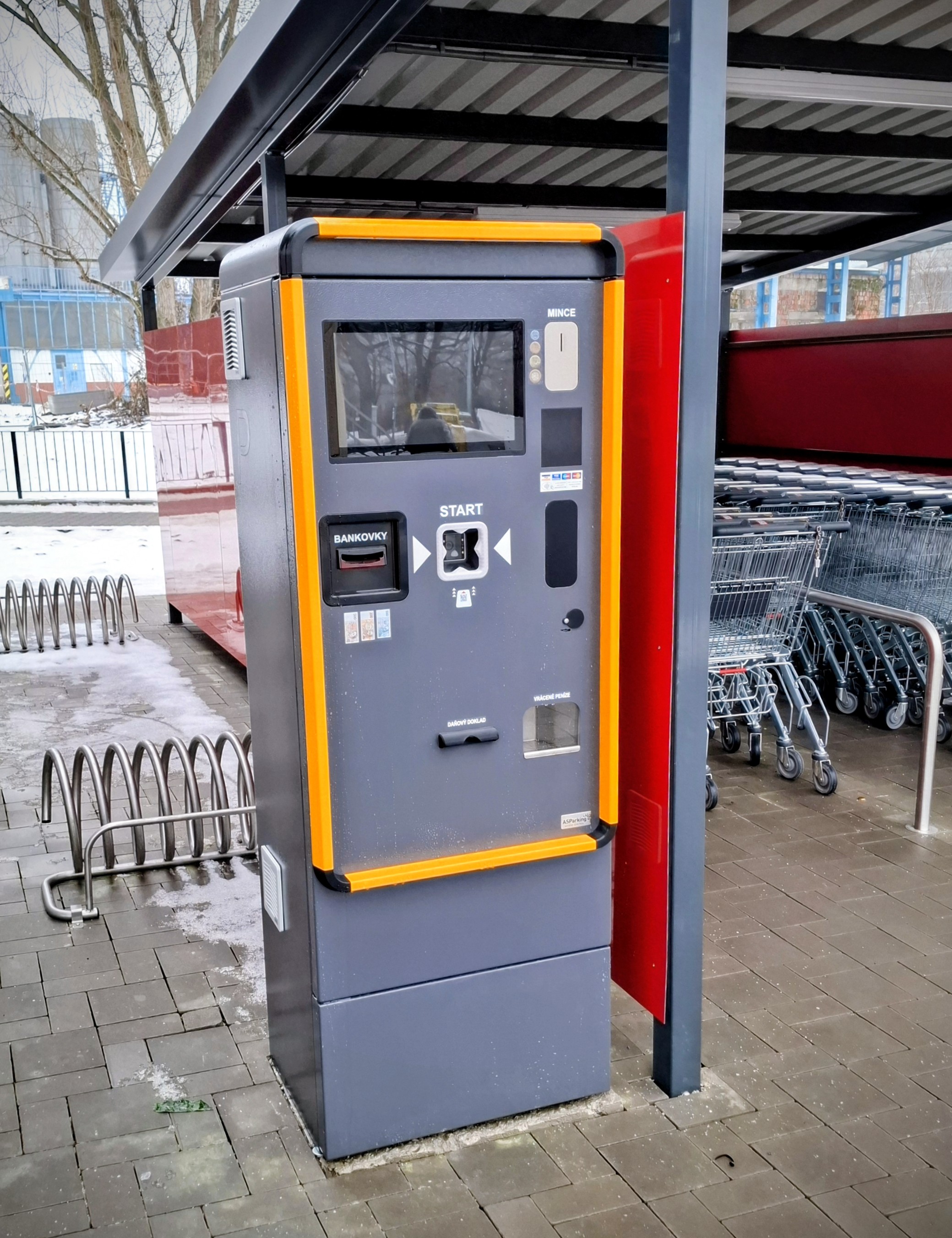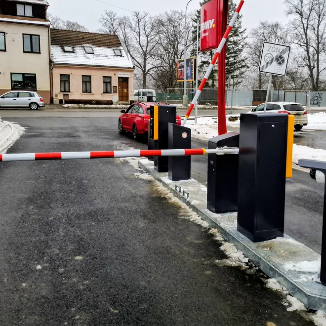 Combined parking system with tickets and cameras in front of the Kaufland Hořovice store
