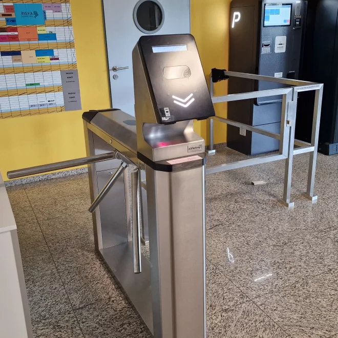 Elegant solution of the ticket system to the sports hall in Brno - access is protected by an entrance turnstile with a terminal, tickets are then issued by an automatic ticket office.